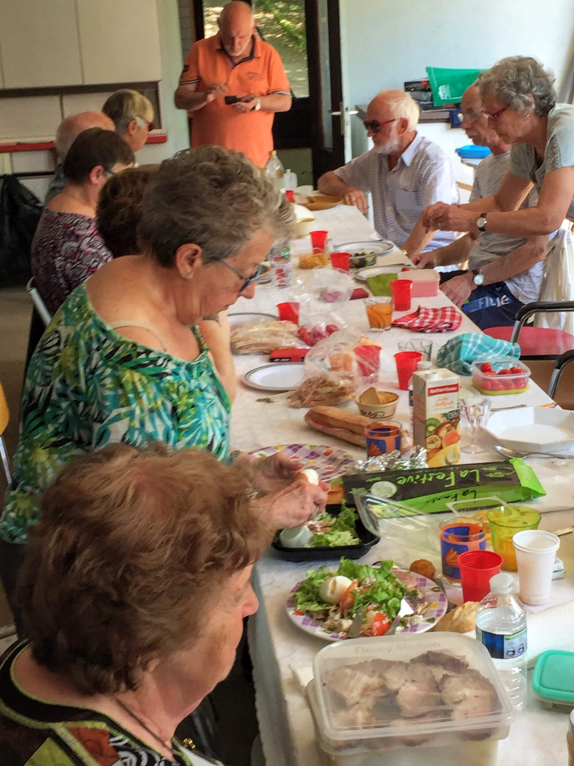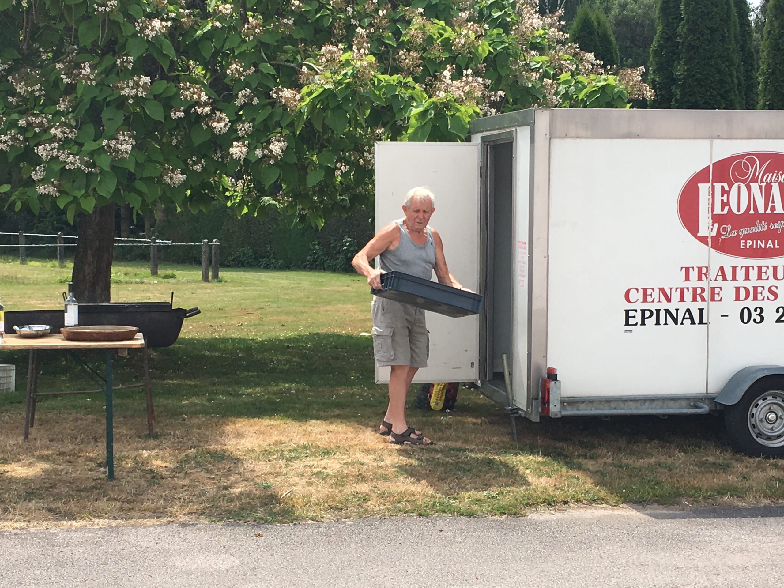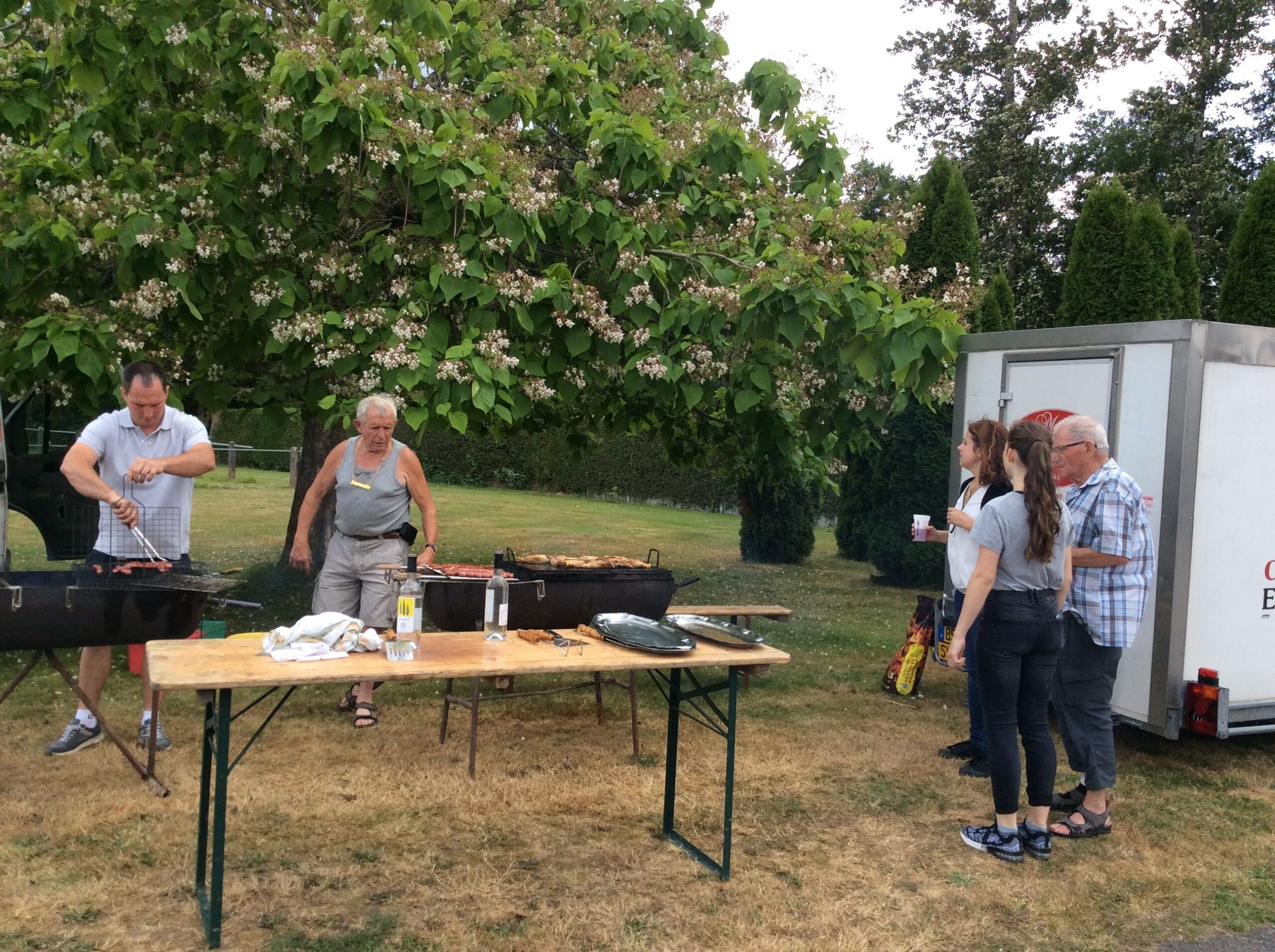 Pendant cette présentation, Daniel BOURQUIN bien secondé par Mathieu CAUVE préparait un énorme barbecue, cuisse de poulet, chipolata, lard et merguez accompagnés de plusieurs salades, le tout servi par de nombreux bénévoles à la centaine de présents. Bien entendu, le tout bien arrosé comme il se doit, apéro, rosé, rouge, eau, jus de fruits à volonté.