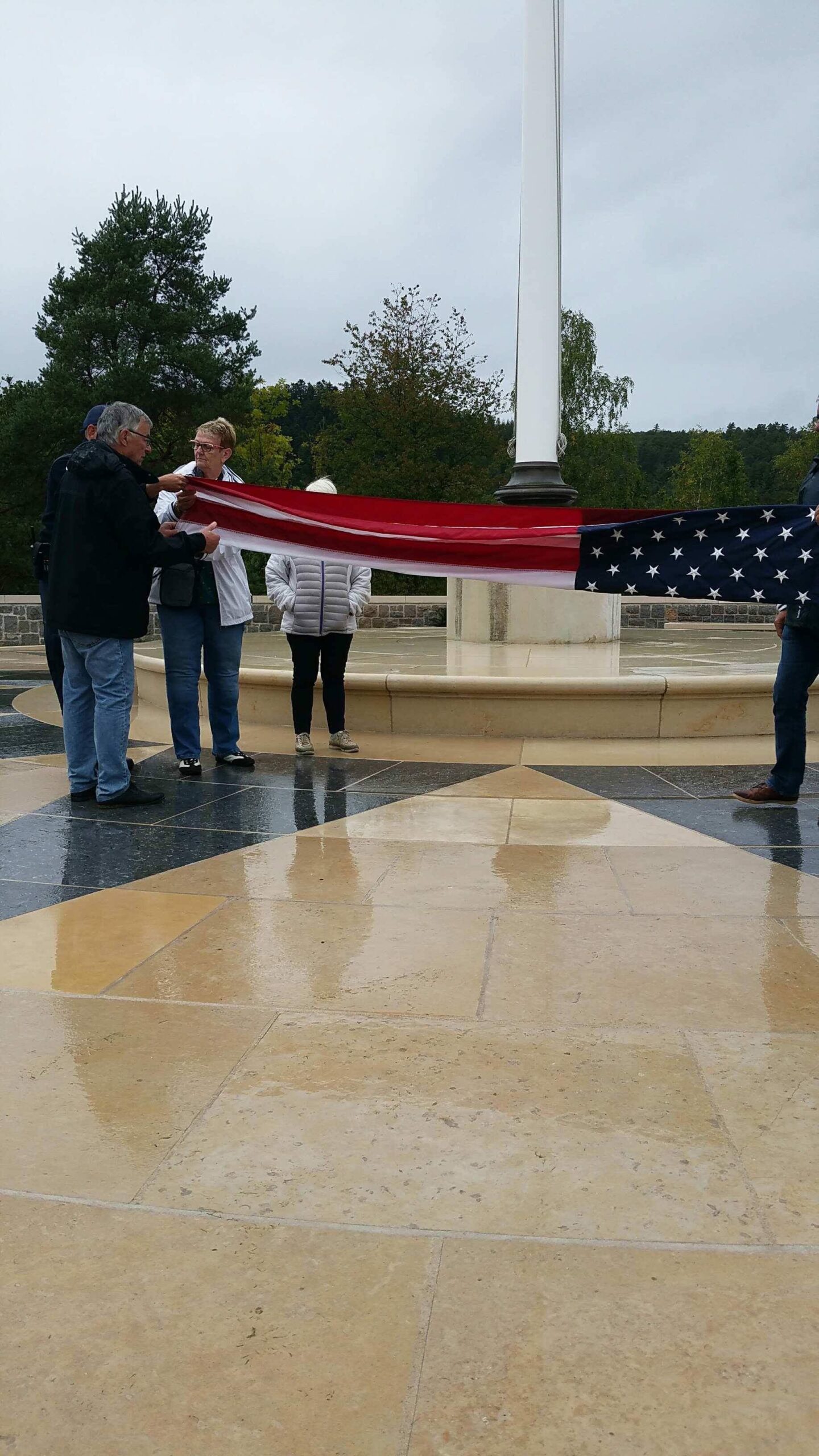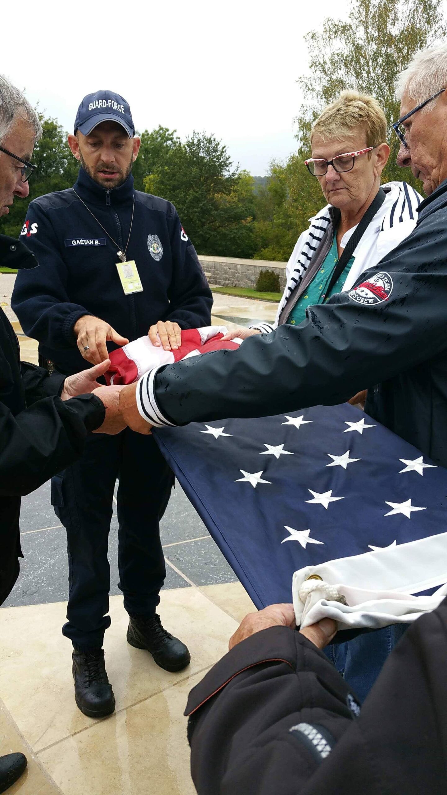 A 16h30 précises, la descente du drapeau par un gardien du cimetière, moment très émouvant précédé de la Marseillaise et de l’hymne Américain. Puis vient le moment très attendu, le pliage du drapeau. Pliage réalisé par 6 volontaires de notre groupe suivant un rituel traditionnel en triangle avec seulement les étoiles apparentes.